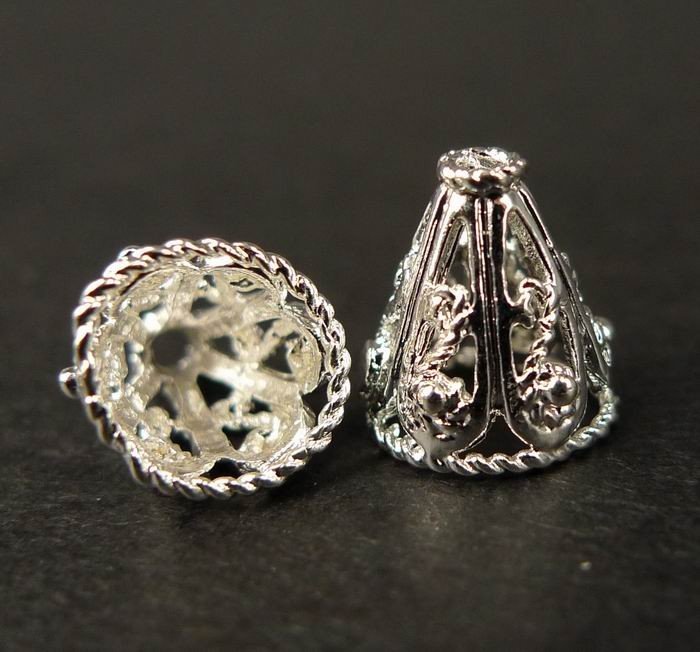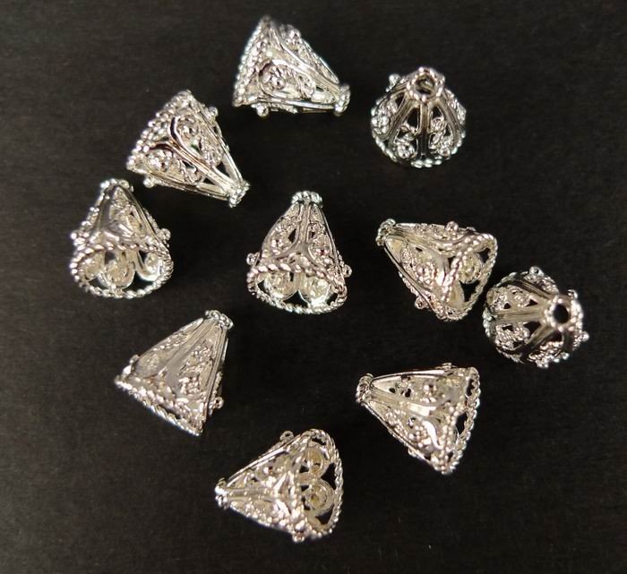 10 stk. koniske perlehætter i sølvfarvet messing.